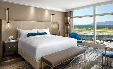 Fairmont Vancouver Airport, the only hotel at Vancouver International Airport, offers 386 exquisitely furnished guestrooms only steps from the airline gates. Guest rooms and suites are spacious, designed with a modern color scheme of soothing neutral tones, and include pillow-top beds and soaking baths for the height of luxury living. From the comfort of your opulent hotel room with soundproof windows for a tranquil stay, observe the planes take off and land in front of a dramatic mountain-scape.